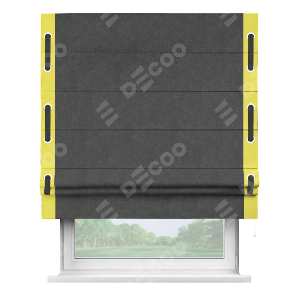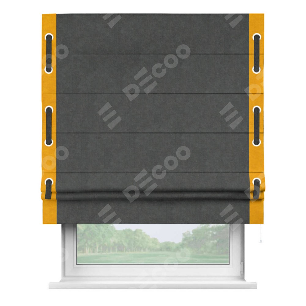 Римская штора производителя «Cortin», используется для проёма, пошита из ткани вельвет тёмно-серый, артикул ткани 33811. Отделка шторы кантом «Стрим Дуо» на кантах расположены люверсы с пояском, ткань для канта используется из вельвета разной расцветки на выбор. Ткань для пояска обычно используется из основной ткани шторы, а так же можно сделать из любой расцветки по желанию. Имеет универсальный механизм и подходит для монтажа: на потолок, на стену и в нишу.