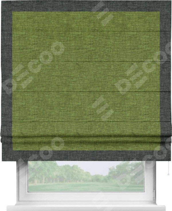 Римская штора производителя «Cortin», используется для проёма, пошита из ткани рогожка димаут салатовый, артикул 80423. Отделка шторы кантом «Чесс», ткань для канта используется из рогожки димаут разной расцветки на выбор. Имеет универсальный механизм и подходит для монтажа: на потолок, на стену и в нишу.