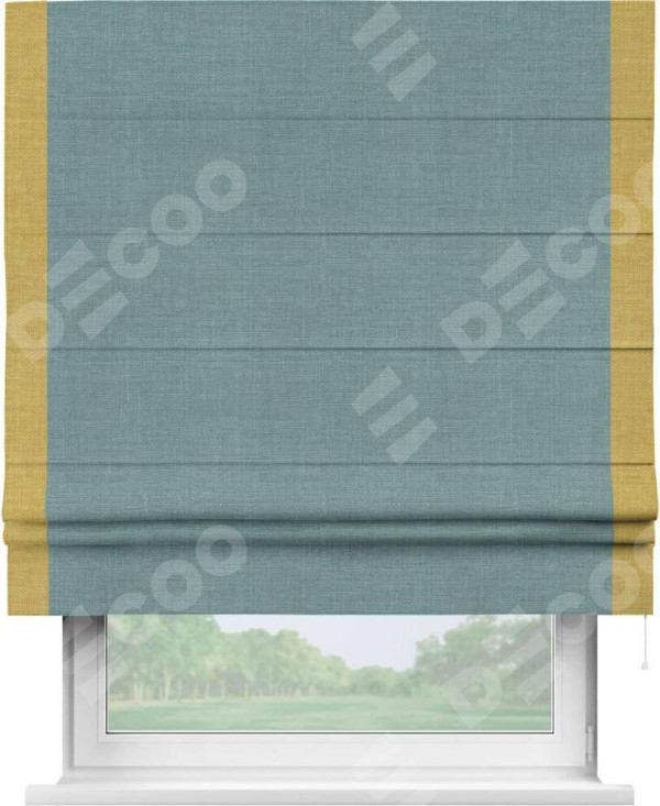 Римская штора производителя «Cortin», используется для проёма, пошита из ткани лён голубой, артикул 74736. Отделка шторы кантом «Стрим Дуо», ткань для канта используется из льна разной расцветки на выбор. Имеет универсальный механизм и подходит для монтажа: на потолок, на стену и в нишу.