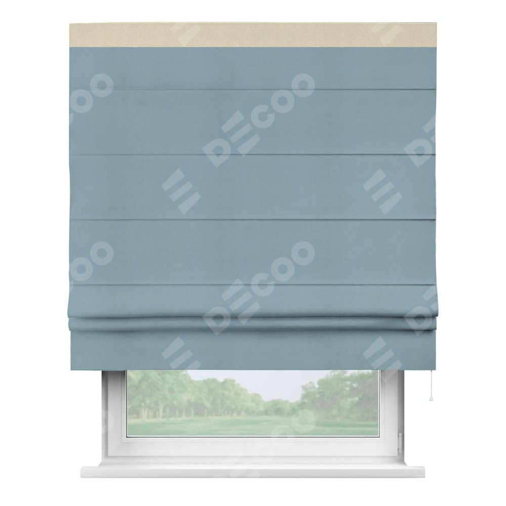 Римская штора производителя «Cortin», используется для проёма, пошита из ткани блэкаут однотонный серо-голубой, артикул ткани 29327−2. Отделка шторы кантом «Кинг», ткань для канта используется из блэкаута однотонного разной расцветки на выбор. Имеет универсальный механизм и подходит для монтажа: на потолок, на стену и в нишу.