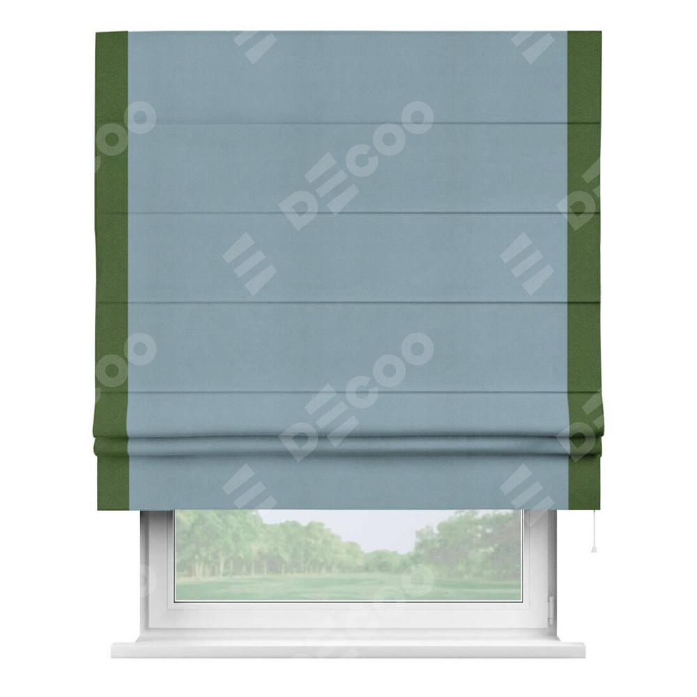 Римская штора производителя «Cortin», используется для проёма, пошита из ткани блэкаут однотонный серо-голубой, артикул ткани 29327−2. Отделка шторы кантом «Стрим Дуо», ткань для канта используется из блэкаута однотонного разной расцветки на выбор. Имеет универсальный механизм и подходит для монтажа: на потолок, на стену и в нишу.