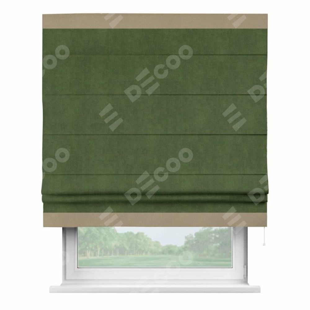 Римская штора производителя «Cortin», используется для проёма, пошита из ткани вельвет тёмно-салатовый, артикул ткани 33805. Отделка шторы кантом «Горизонт», ткань для канта используется из вельвета разной расцветки на выбор. Имеет универсальный механизм и подходит для монтажа: на потолок, на стену и в нишу.
