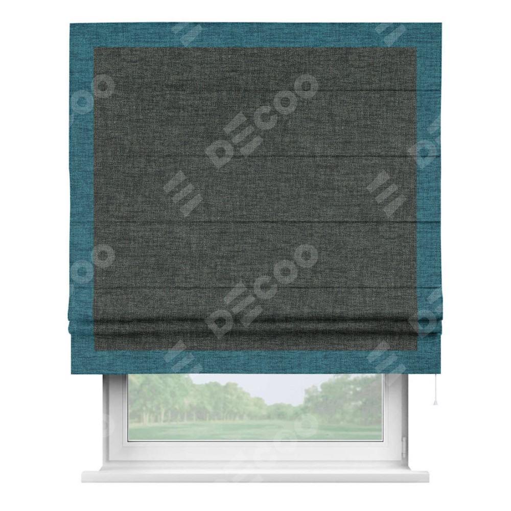 Римская штора производителя «Cortin», используется для проёма, пошита из ткани рогожка димаут графит, артикул 102−34. Отделка шторы кантом «Чесс», ткань для канта используется из рогожки димаут разной расцветки на выбор. Имеет универсальный механизм и подходит для монтажа: на потолок, на стену и в нишу.