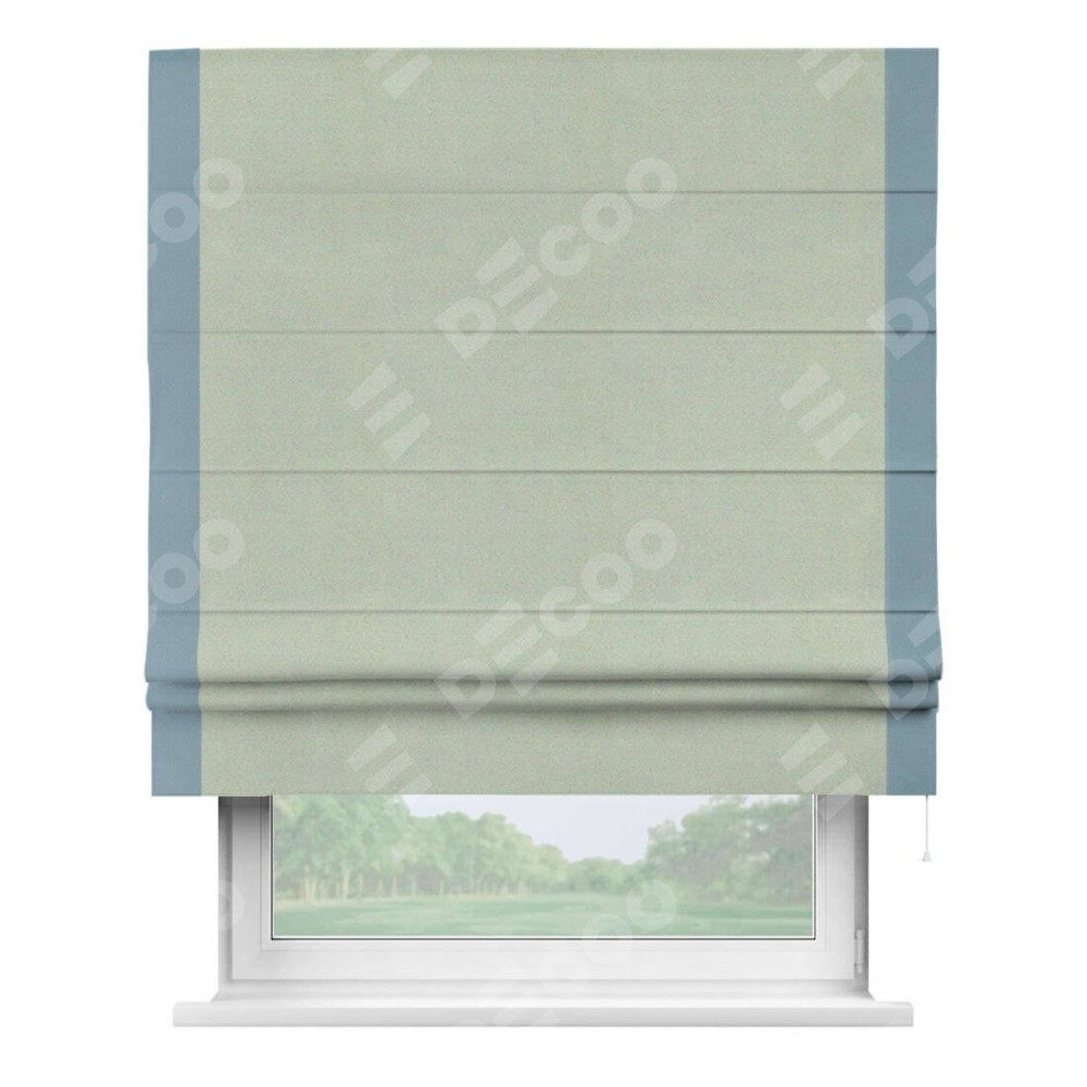 Римская штора производителя «Cortin», используется для проёма, пошита из ткани блэкаут однотонный светло-серый, артикул ткани 29332−2. Отделка шторы кантом «Стрим Дуо», ткань для канта используется из блэкаута однотонного разной расцветки на выбор. Имеет универсальный механизм и подходит для монтажа: на потолок, на стену и в нишу.