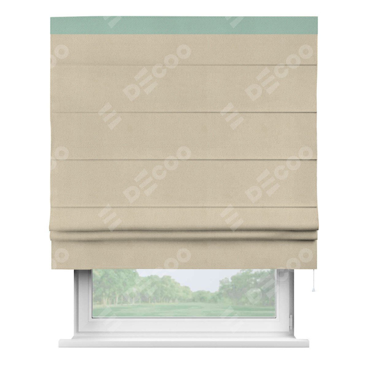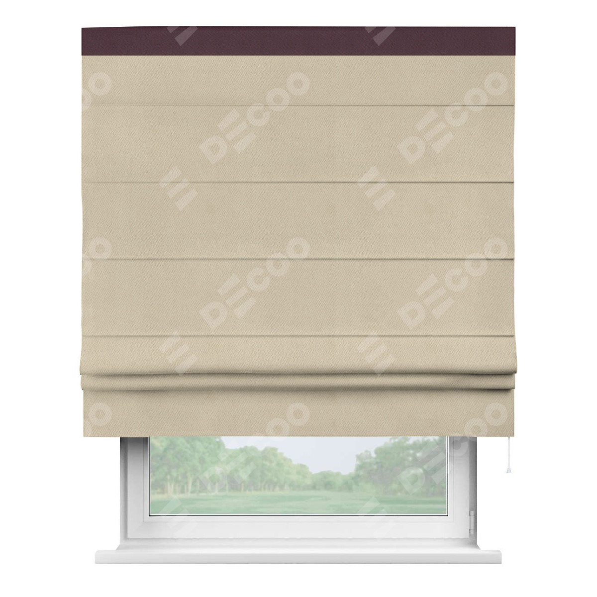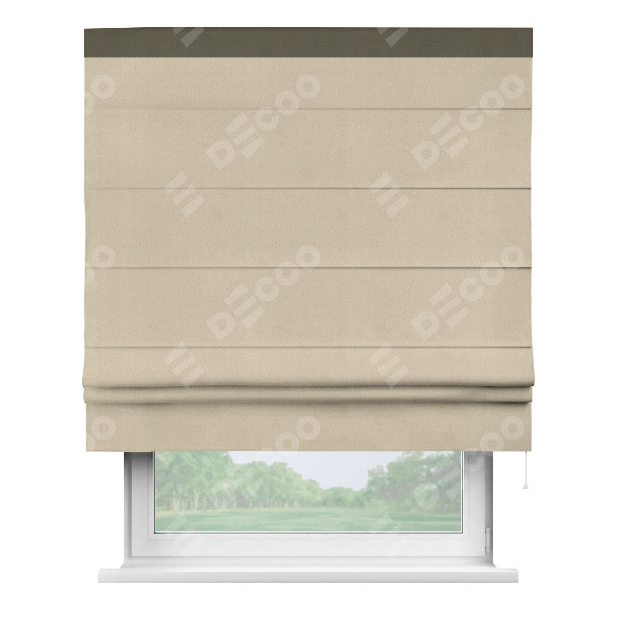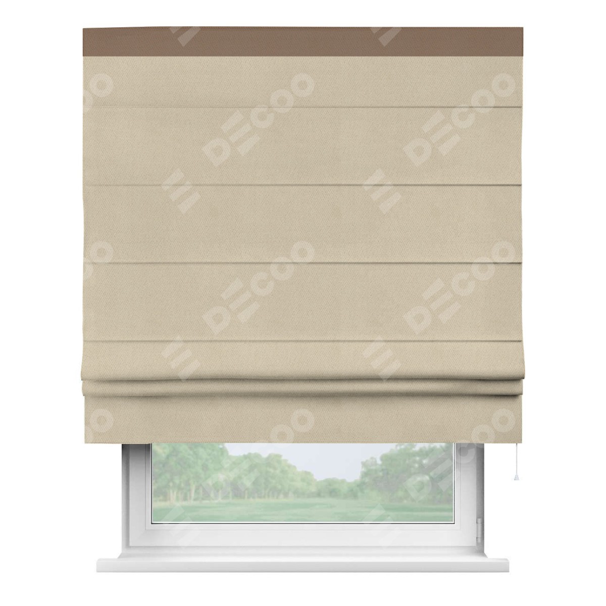Римская штора производителя «Cortin», используется для проёма, пошита из ткани блэкаут однотонный кофейно-бежевый, артикул ткани 12095−1. Отделка шторы кантом «Кинг», ткань для канта используется из блэкаута однотонного разной расцветки на выбор. Имеет универсальный механизм и подходит для монтажа: на потолок, на стену и в нишу.