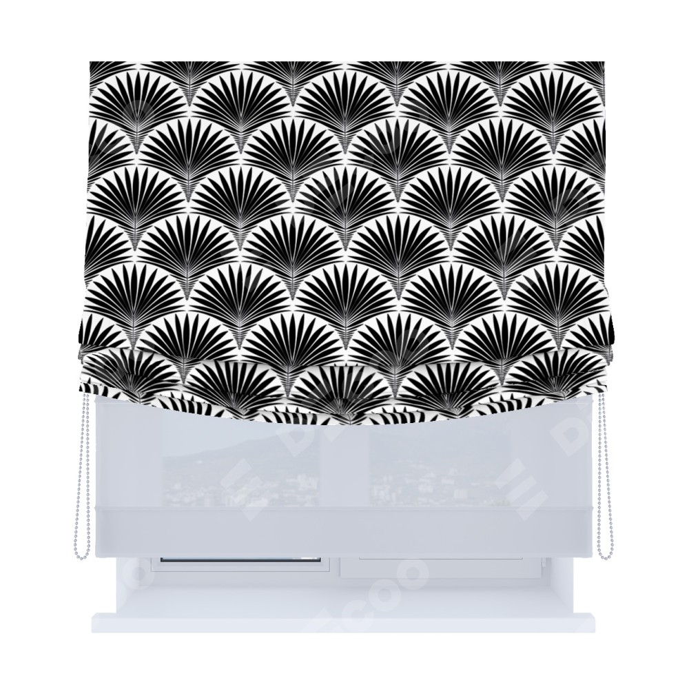 Римская штора «Кортин», день-ночь с мягкими складками, «Арт-деко листья черный»