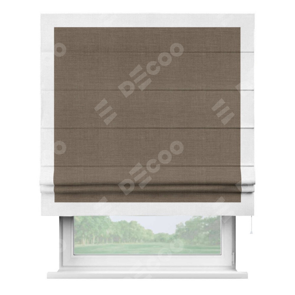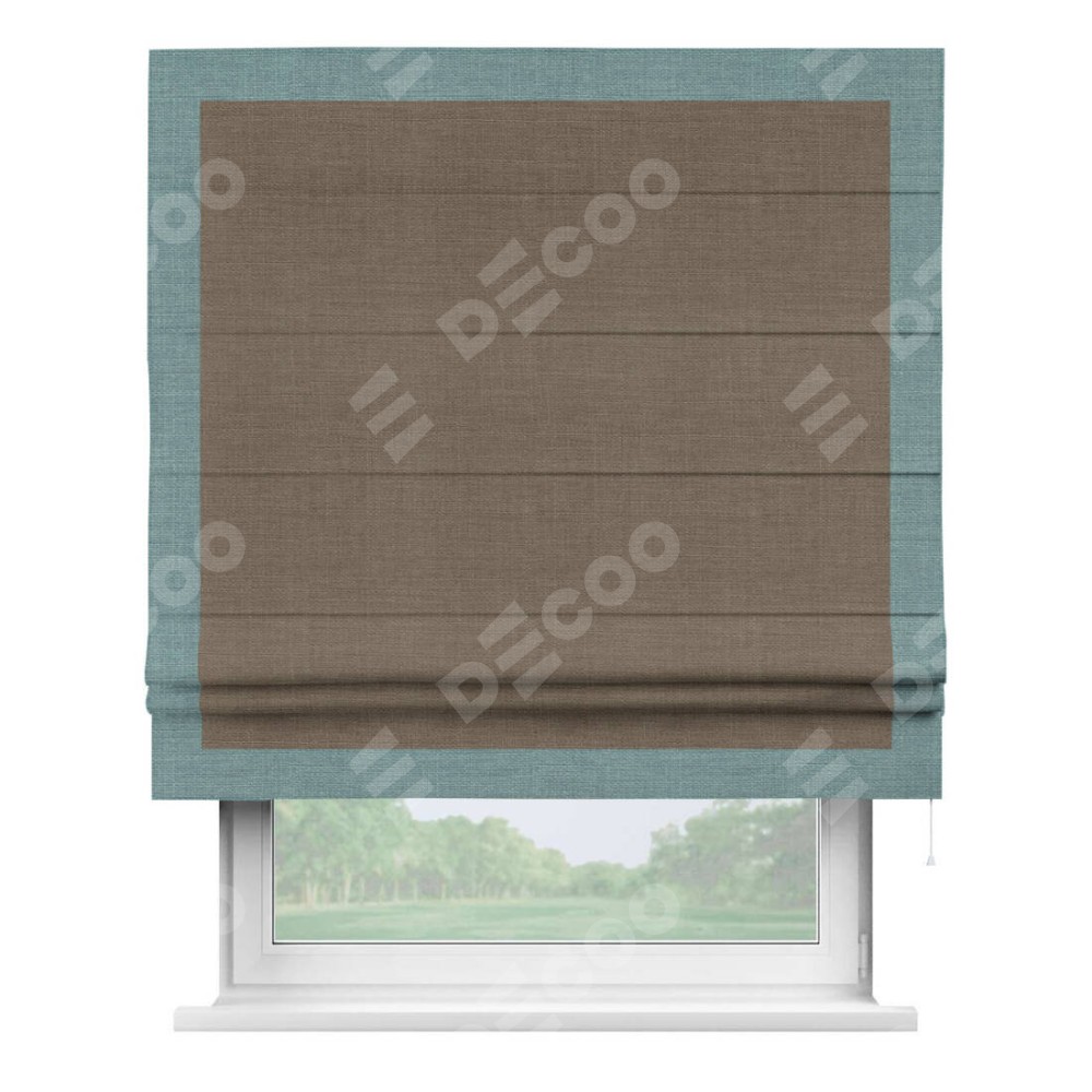 Римская штора производителя «Cortin», используется для проёма, пошита из ткани лён мокко, артикул 7444. Отделка шторы кантом «Чесс», ткань для канта используется из льна разной расцветки на выбор. Имеет универсальный механизм и подходит для монтажа: на потолок, на стену и в нишу.