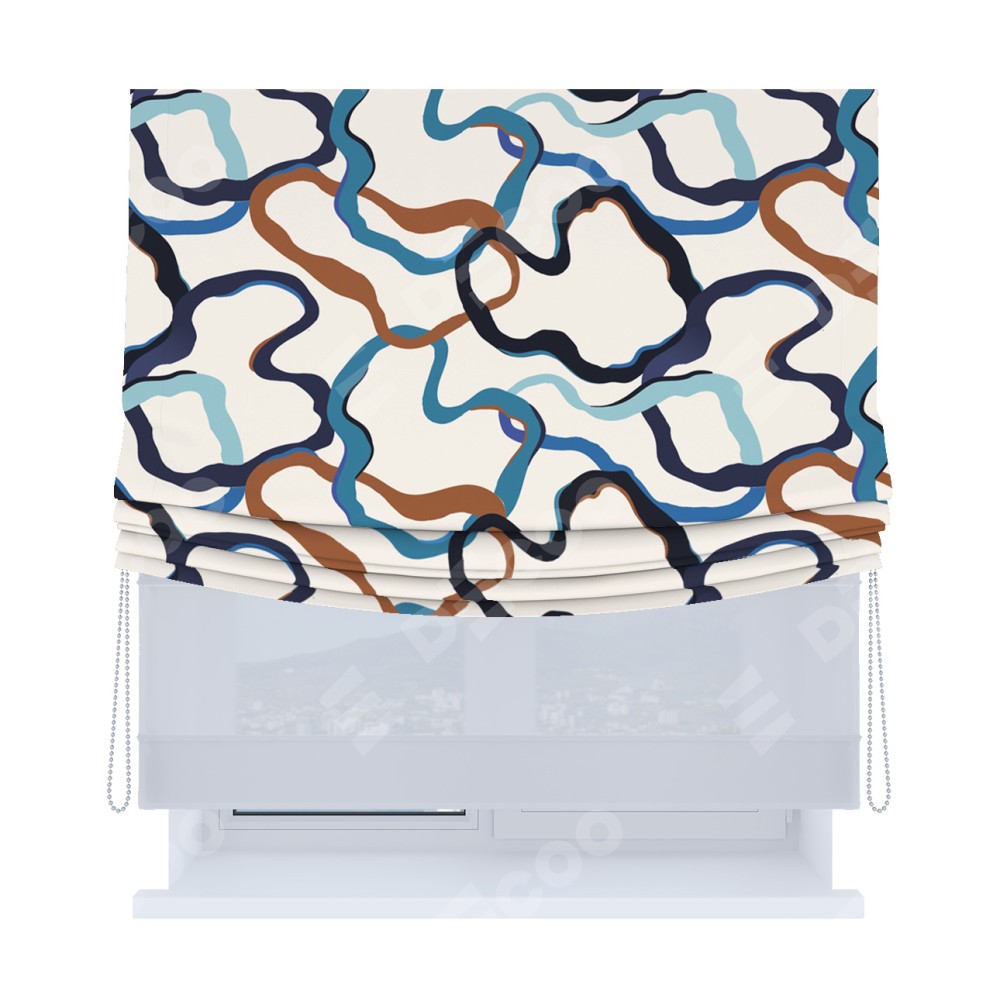 Римская штора день-ночь производителя «Cortin», используется для проёма, пошита из двух полотен, с лицевой блэкаут с нанесением сублимационной печати «Волнистые ленты», вторая ткань тюль (по стандарту комплектуется тюль белого цвета артикул V-01). Имеет универсальный механизм и подходит для монтажа: на потолок, на стену и в нишу. Удобное управление каждой шторой отдельно.