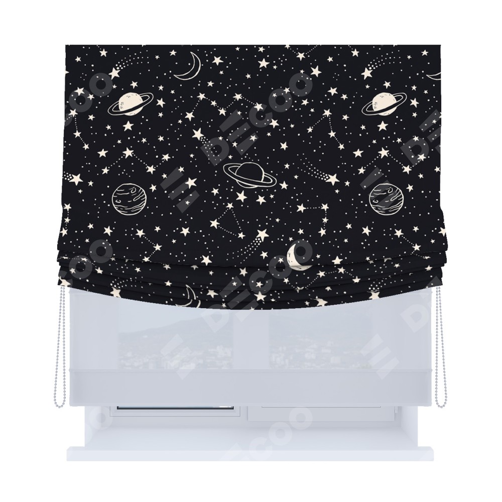 Римская штора день-ночь производителя «Cortin», используется для проёма, пошита из двух полотен, с лицевой блэкаут с нанесением сублимационной печати «Глубокий космос», вторая ткань тюль (по стандарту комплектуется тюль белого цвета артикул V-01). Имеет универсальный механизм и подходит для монтажа: на потолок, на стену и в нишу. Удобное управление каждой шторой отдельно.