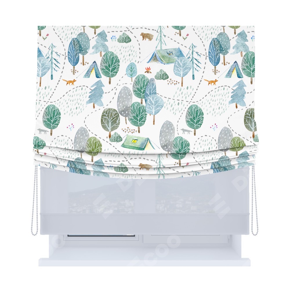 Римская штора день-ночь производителя «Cortin», используется для проёма, пошита из двух полотен, с лицевой блэкаут с нанесением сублимационной печати «Лесистая местность», вторая ткань тюль (по стандарту комплектуется тюль белого цвета артикул V-01). Имеет универсальный механизм и подходит для монтажа: на потолок, на стену и в нишу. Удобное управление каждой шторой отдельно.