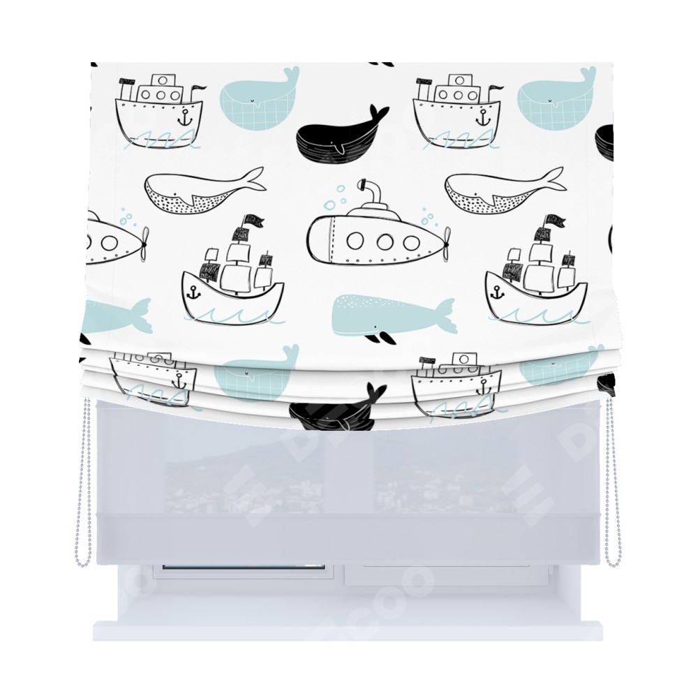 Римская штора день-ночь производителя «Cortin», используется для проёма, пошита из двух полотен, с лицевой блэкаут с нанесением сублимационной печати «Морская прогулка», вторая ткань тюль (по стандарту комплектуется тюль белого цвета артикул V-01). Имеет универсальный механизм и подходит для монтажа: на потолок, на стену и в нишу. Удобное управление каждой шторой отдельно.