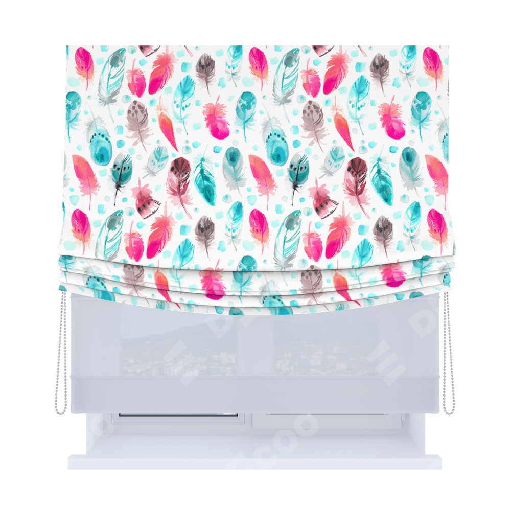 Римская штора день-ночь производителя «Cortin», используется для проёма, пошита из двух полотен, с лицевой блэкаут с нанесением сублимационной печати «Перья», вторая ткань тюль (по стандарту комплектуется тюль белого цвета артикул V-01). Имеет универсальный механизм и подходит для монтажа: на потолок, на стену и в нишу. Удобное управление каждой шторой отдельно.