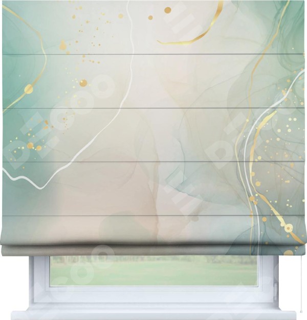 Римская штора производителя «Cortin», используется для проёма, пошита из ткани блэкаут с нанесением сублимационной печати «Изумрудно-серый мрамор». Имеет универсальный механизм и подходит для монтажа: на потолок, на стену и в нишу.