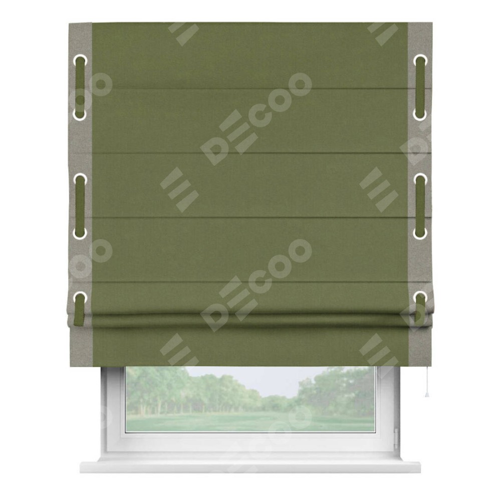 Римская штора производителя «Cortin», используется для проёма, пошита из ткани лён блэкаут оливковый, артикул 69516. Отделка шторы кантом «Стрим Дуо» на кантах расположены люверсы с пояском, ткань для канта используется из льна разной расцветки на выбор. Ткань для пояска обычно используется из основной ткани шторы, а так же можно сделать из любой расцветки по желанию. Имеет универсальный механизм и подходит для монтажа: на потолок, на стену и в нишу.