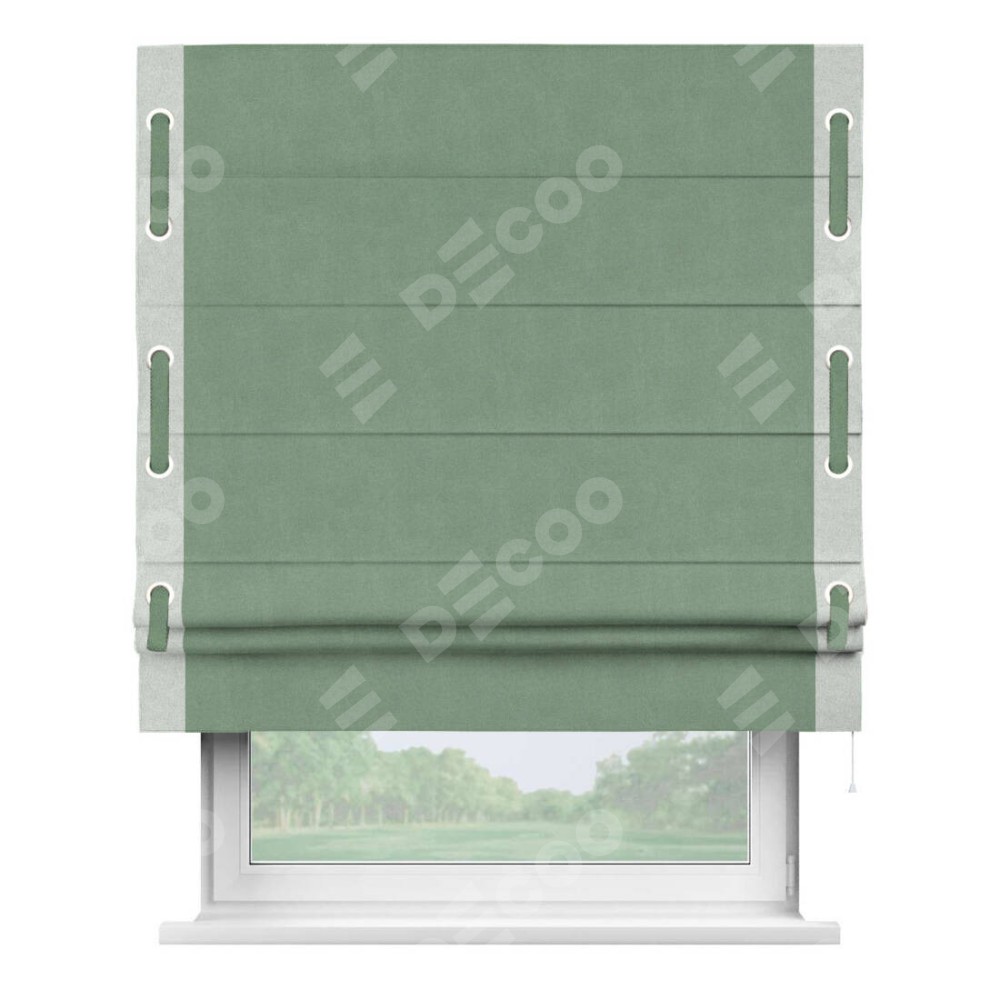 Римская штора производителя «Cortin», используется для проёма, пошита из ткани лён блэкаут светло-бирюзовый, артикул 69443. Отделка шторы кантом «Стрим Дуо» на кантах расположены люверсы с пояском, ткань для канта используется из льна разной расцветки на выбор. Ткань для пояска обычно используется из основной ткани шторы, а так же можно сделать из любой расцветки по желанию. Имеет универсальный механизм и подходит для монтажа: на потолок, на стену и в нишу.