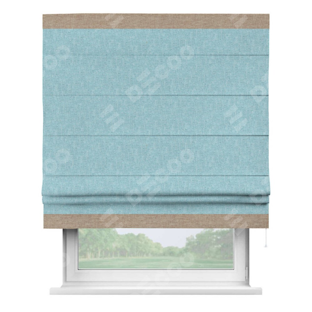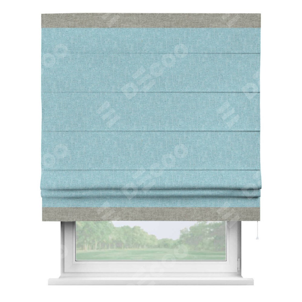 Римская штора производителя «Cortin», используется для проёма, пошита из ткани лён кашемир голубой, артикул 21616. Отделка шторы кантом «Горизонт», ткань для канта используется из льна разной расцветки на выбор. Имеет универсальный механизм и подходит для монтажа: на потолок, на стену и в нишу.