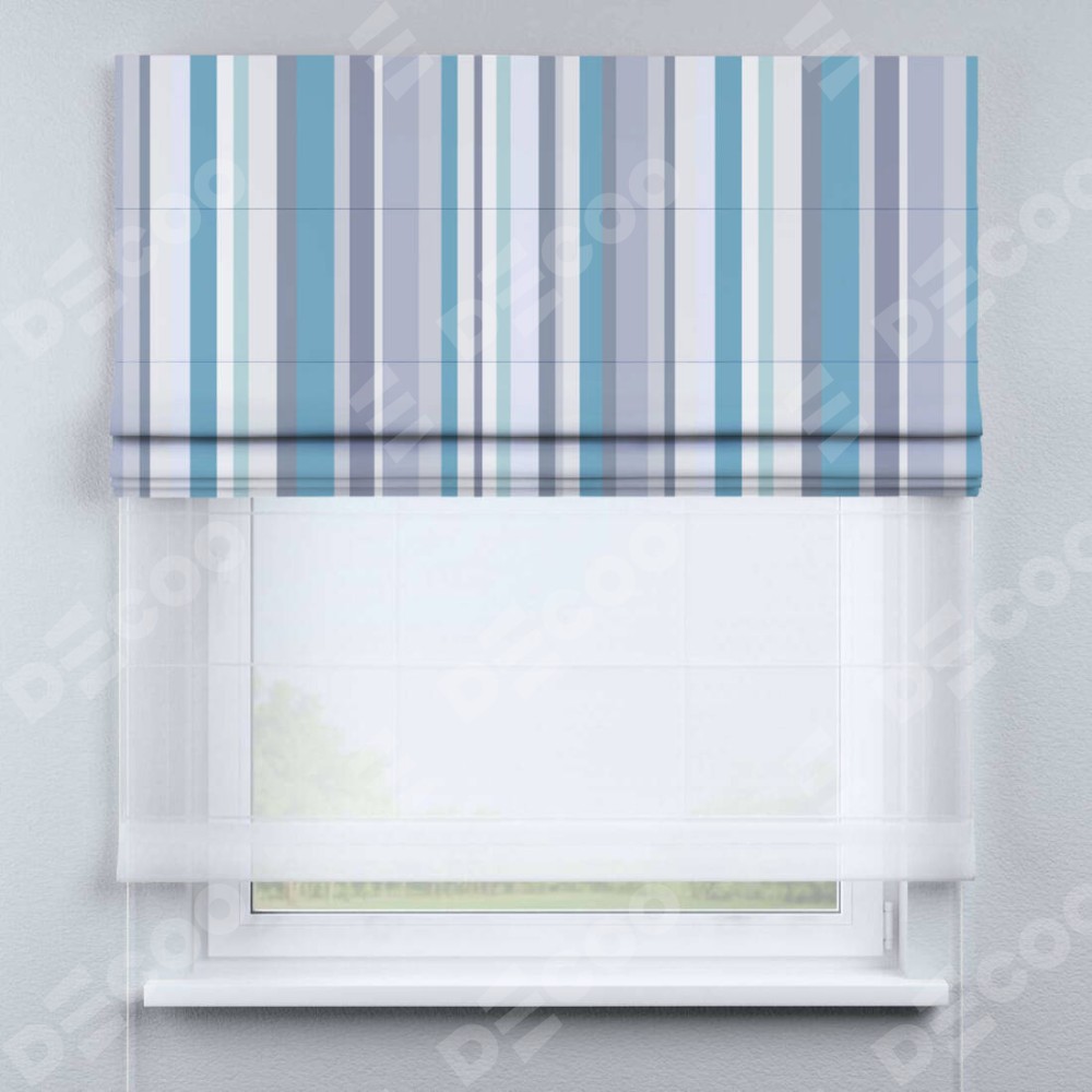 Римская штора день-ночь производителя «Cortin», используется для проёма, пошита из двух полотен, с лицевой блэкаут с нанесением сублимационной печати «Морские линии», вторая ткань тюль (по стандарту комплектуется тюль белого цвета артикул V-01). Имеет универсальный механизм и подходит для монтажа: на потолок, на стену и в нишу.