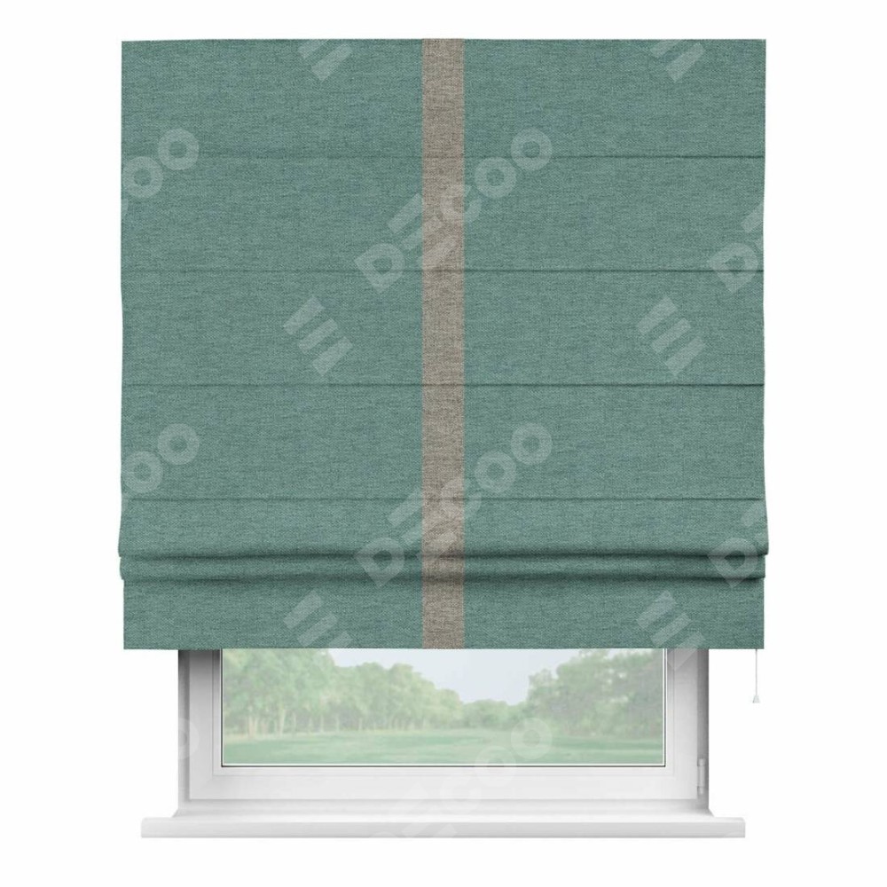 Римская штора производителя «Cortin», используется для проёма, пошита из ткани стиф димаут бирюзовый, артикул 18196. Отделка шторы кантом «Хайвэй», ткань для канта используется из стифа разной расцветки на выбор. Имеет универсальный механизм и подходит для монтажа: на потолок, на стену и в нишу.