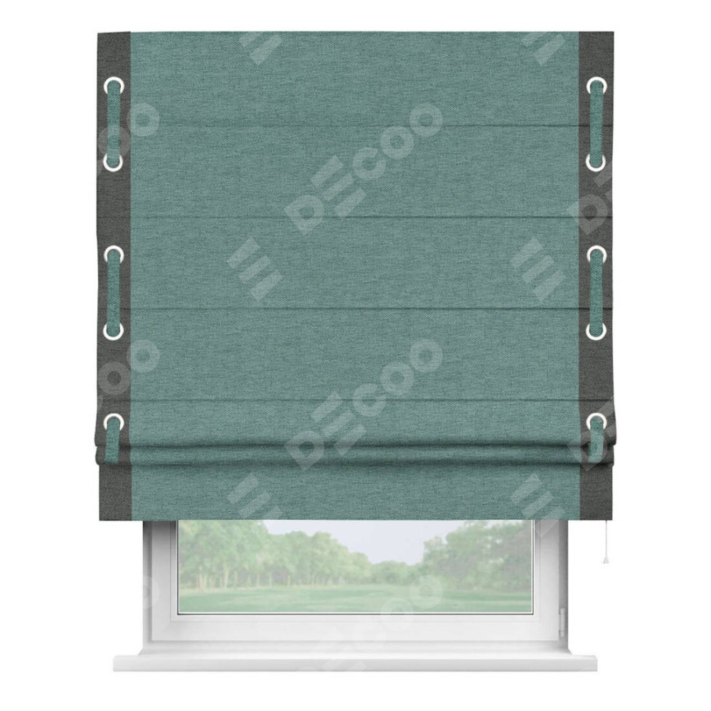 Римская штора производителя «Cortin», используется для проёма, пошита из ткани стиф димаут бирюзовый, артикул 18196. Отделка шторы кантом «Стрим Дуо» на кантах расположены люверсы с пояском, ткань для канта используется из стифа разной расцветки на выбор. Ткань для пояска обычно используется из основной ткани шторы, а так же можно сделать из любой расцветки по желанию. Имеет универсальный механизм и подходит для монтажа: на потолок, на стену и в нишу.