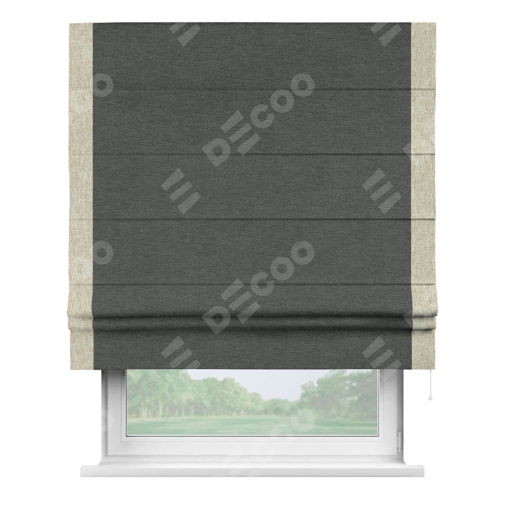 Римская штора производителя «Cortin», используется для проёма, пошита из ткани стиф димаут графит, артикул 44026. Отделка шторы кантом «Стрим Дуо», ткань для канта используется из стифа разной расцветки на выбор. Имеет универсальный механизм и подходит для монтажа: на потолок, на стену и в нишу.