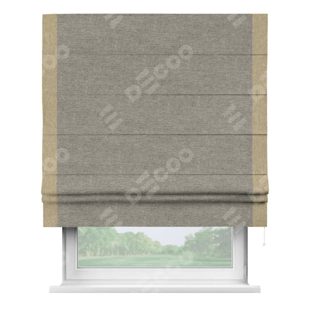 Римская штора производителя «Cortin», используется для проёма, пошита из ткани стиф димаут серо-коричневый, артикул 44028. Отделка шторы кантом «Стрим Дуо», ткань для канта используется из стифа разной расцветки на выбор. Имеет универсальный механизм и подходит для монтажа: на потолок, на стену и в нишу.