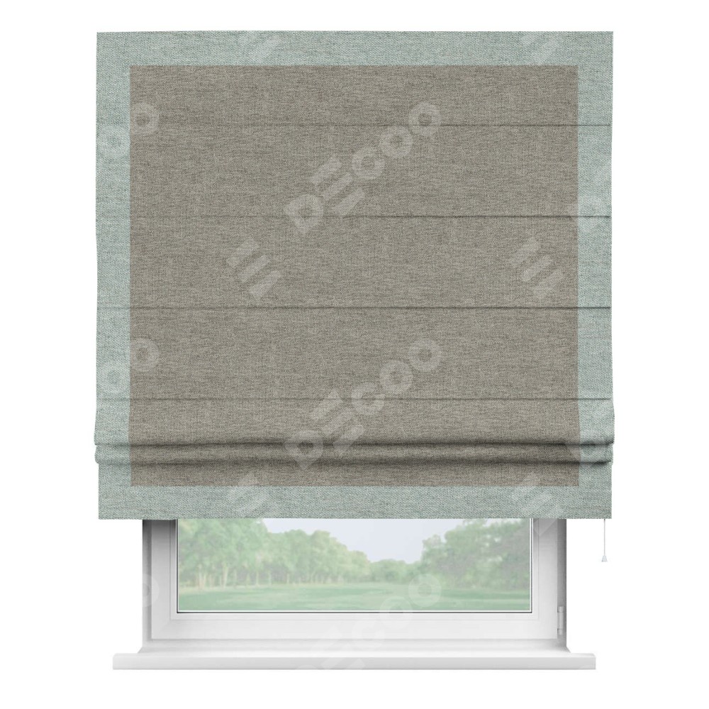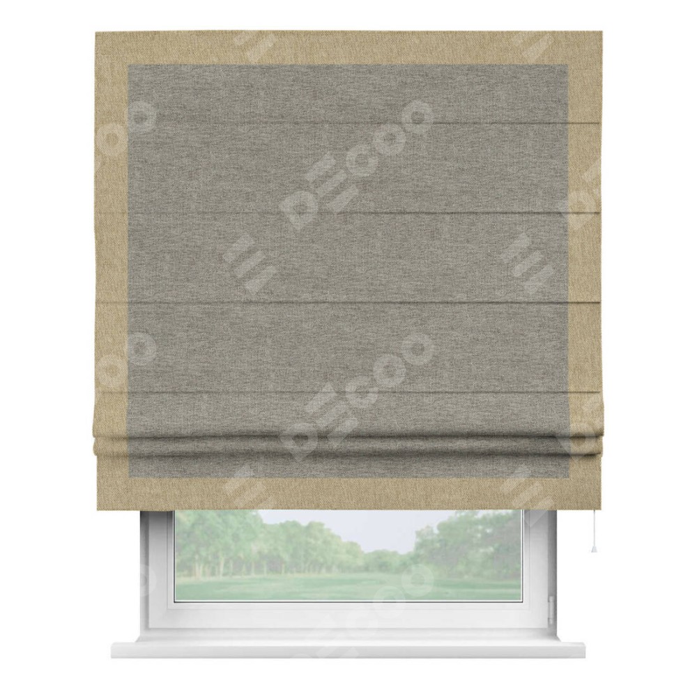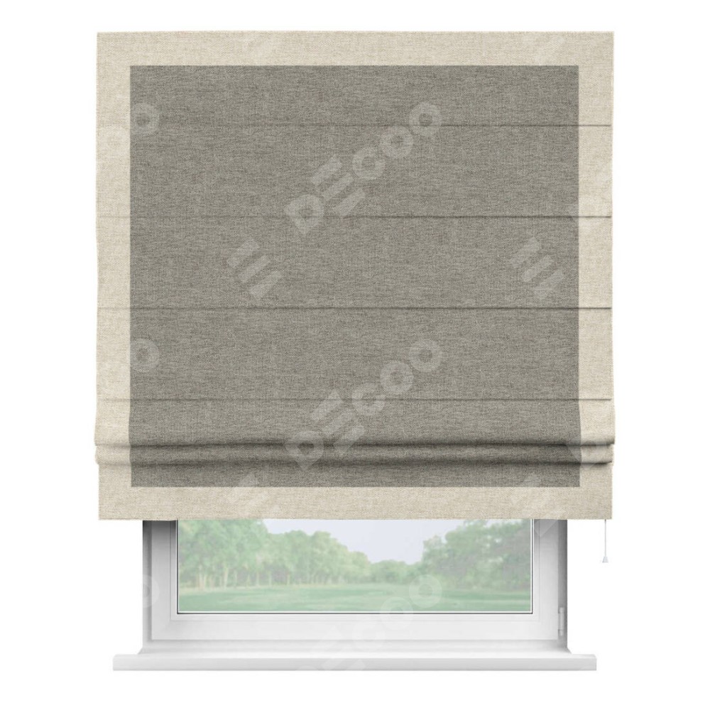 Римская штора производителя «Cortin», используется для проёма, пошита из ткани стиф димаут серо-коричневый, артикул 44028. Отделка шторы кантом «Чесс», ткань для канта используется из стифа разной расцветки на выбор. Имеет универсальный механизм и подходит для монтажа: на потолок, на стену и в нишу.