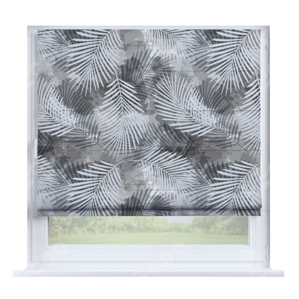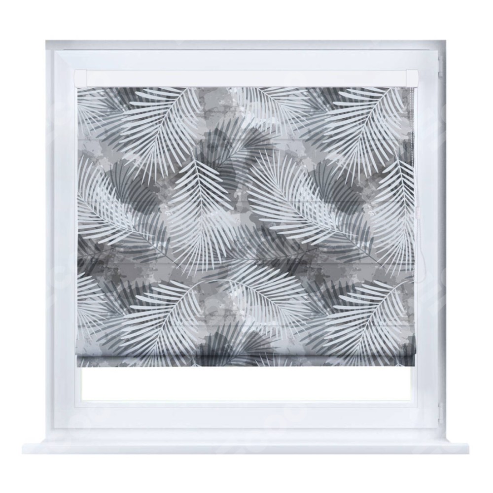 Римская штора производителя «Cortin», устанавливается на створку окна, пошита из ткани блэкаут с нанесением сублимационной печати «Листья в тени». Штора шьётся по индивидуальным размерам, для данного типа римской шторы возможная ширина от 35 до 150 см., высота до 250 см.