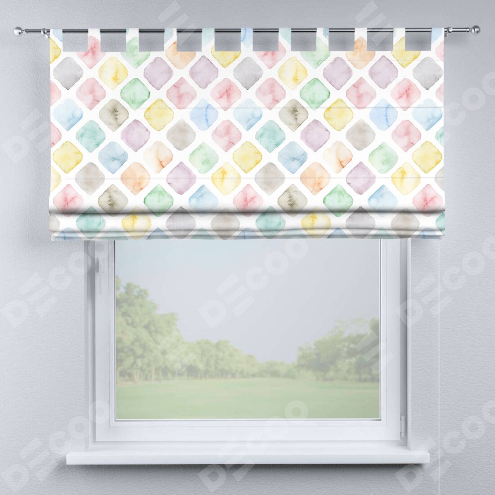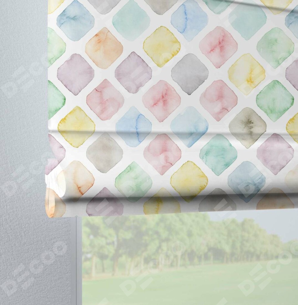 Римская штора производителя «Cortin», используется для проёма, пошита из ткани блэкаут с нанесением сублимационной печати «Мозаика акварель». Данная модель пошита на петлях, комплектуется на выбор круглым карнизом и подходит для монтажа на стену. Римская штора на петлях имеет простую систему регулировки высоты, отличительным преимуществом данной модели является простой способ монтажа. Достаточно повесить ее на трубу и штора готова!