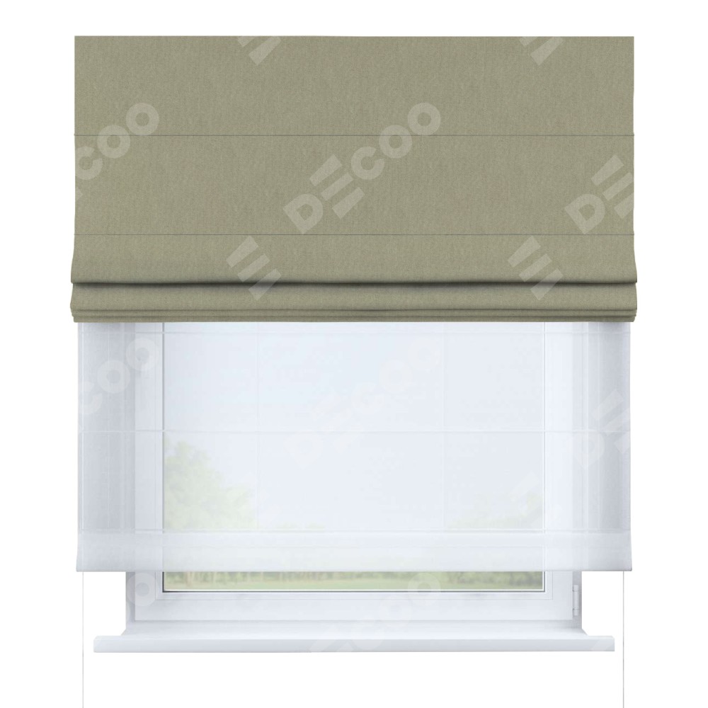 Римская штора день-ночь производителя «Cortin», используется для проёма, пошита из двух полотен, с лицевой стороны канвас латте артикул v-12490, вторая ткань тюль (по стандарту комплектуется тюль белого цвета артикул V-01). Имеет универсальный механизм и подходит для монтажа: на потолок, на стену и в нишу.