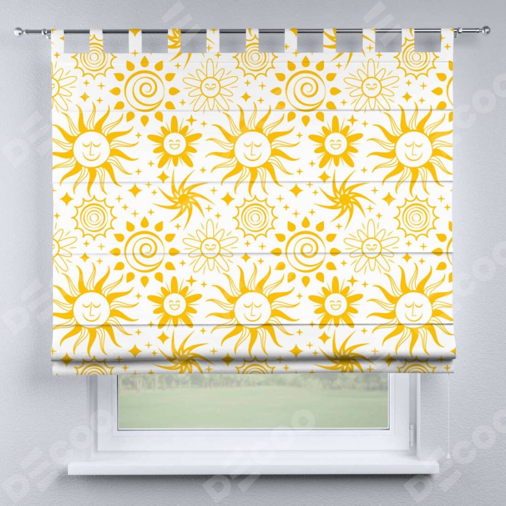 Римская штора производителя «Cortin», используется для проёма, пошита из ткани блэкаут с нанесением сублимационной печати «Солнышки». Данная модель пошита на петлях, комплектуется на выбор круглым карнизом и подходит для монтажа на стену. Римская штора на петлях имеет простую систему регулировки высоты, отличительным преимуществом данной модели является простой способ монтажа. Достаточно повесить ее на трубу и штора готова!