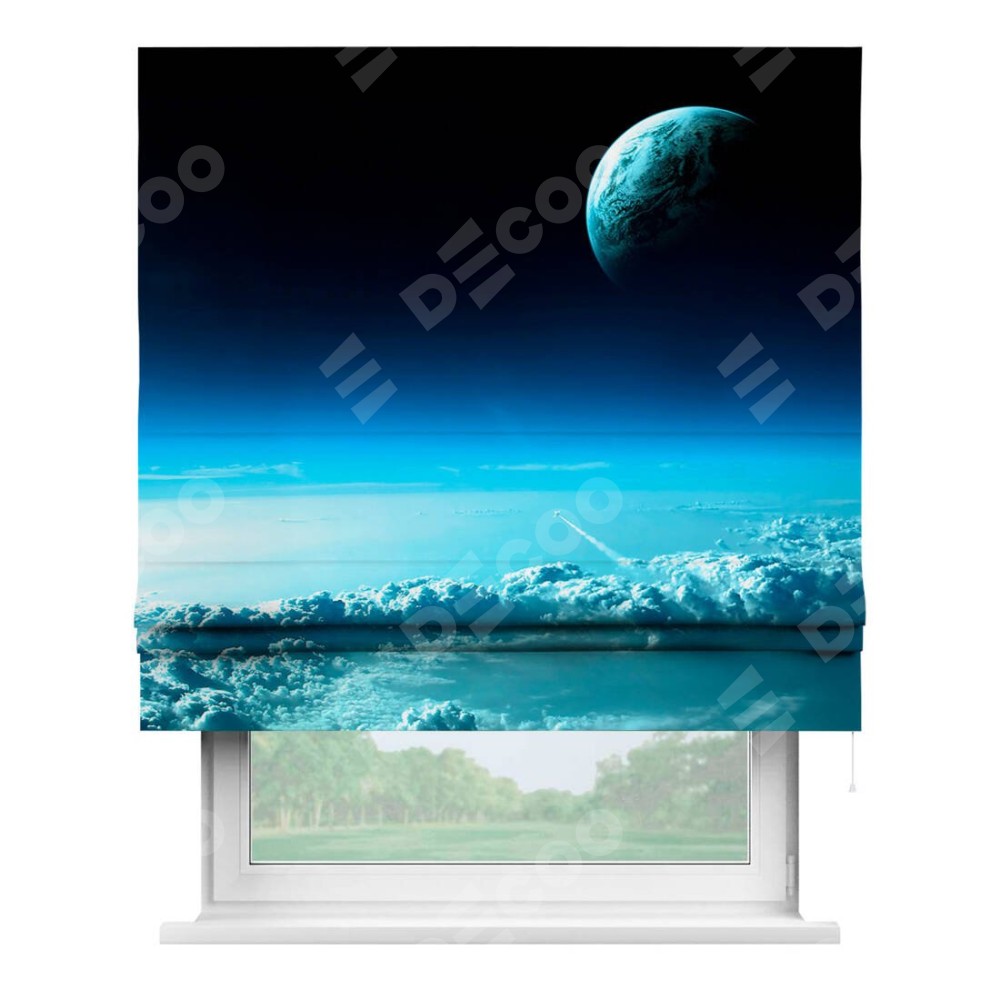Римская штора производителя «Cortin», используется для проёма, пошита из ткани блэкаут с нанесением сублимационной печати «Горизонты вселенной». Имеет универсальный механизм и подходит для монтажа: на потолок, на стену и в нишу.