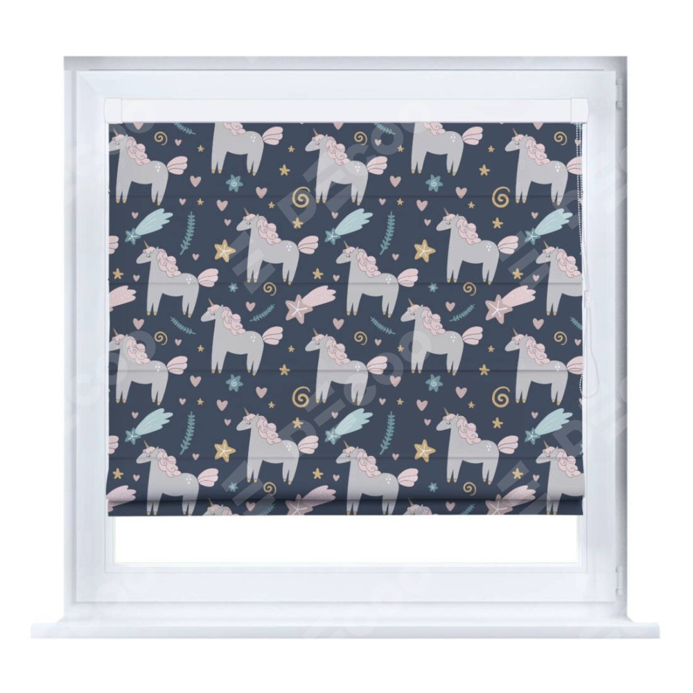 Римская штора производителя «Cortin», устанавливается на створку окна, пошита из ткани блэкаут с нанесением сублимационной печати «Милые единороги». Штора шьётся по индивидуальным размерам, для данного типа римской шторы возможная ширина от 35 до 150 см., высота до 250 см.