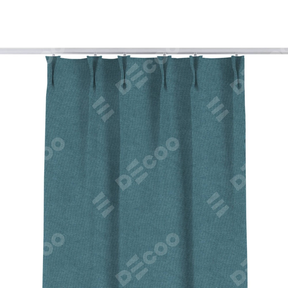 Комплект прямых штор, от производителя «Cortin», пошиты из ткани лён димаут светло-синий, артикул ткани 91007. С изнаночной стороны в верхней части штор пристрачивается шторная лента с декоративными складками «Кустик». Для создания элегантных складок прямые шторы шьются по стандарту с коэффициентом 1:2 (на 100 см. ширины проёма 200 см. ширины ткани).