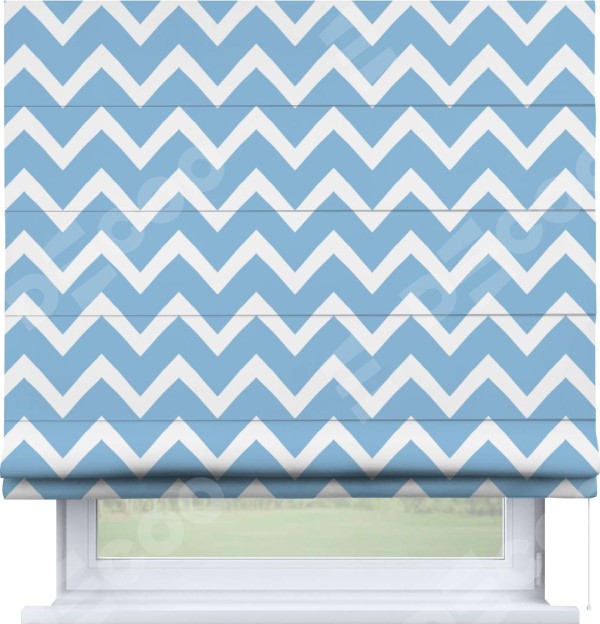 Римская штора производителя «Cortin», используется для проёма, пошита из ткани блэкаут с нанесением сублимационной печати «Зигзаг средний». Имеет универсальный механизм и подходит для монтажа: на потолок, на стену и в нишу.