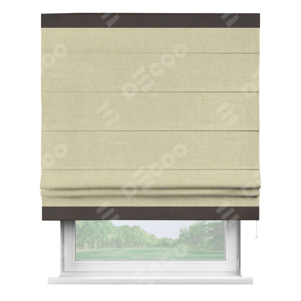 Римская штора производителя «Cortin», используется для проёма, пошита из ткани лён димаут шампань, артикул 90994. Отделка шторы кантом «Горизонт», ткань для канта используется из льна димаут разной расцветки на выбор. Имеет универсальный механизм и подходит для монтажа: на потолок, на стену и в нишу.