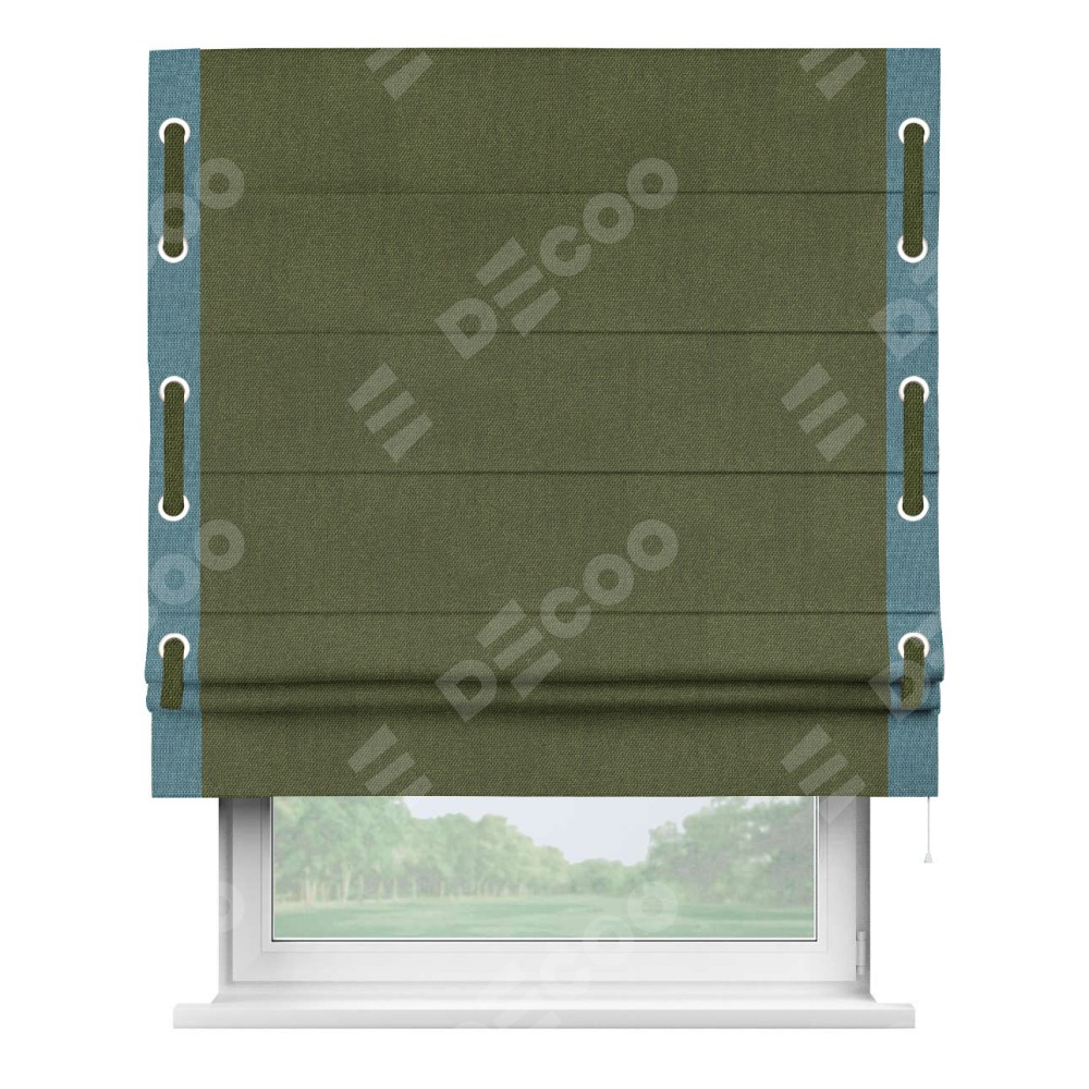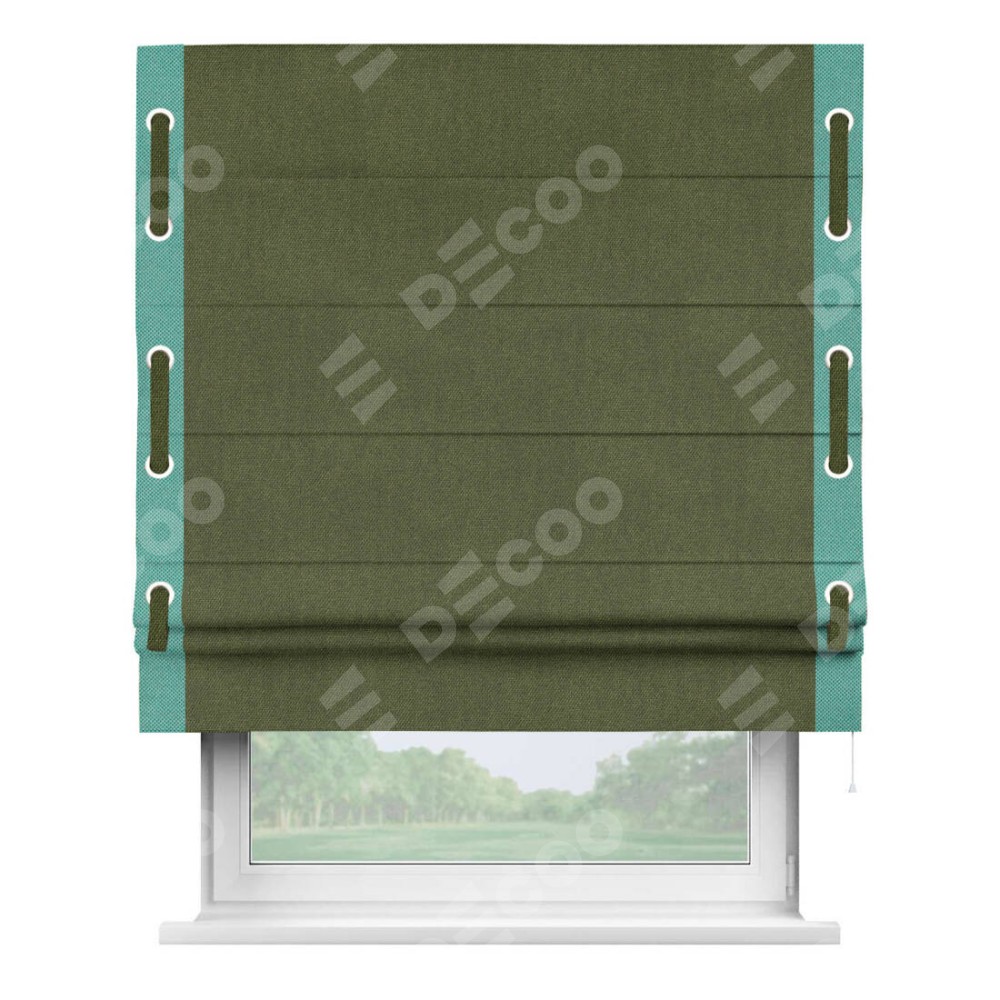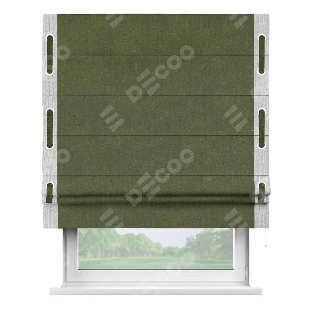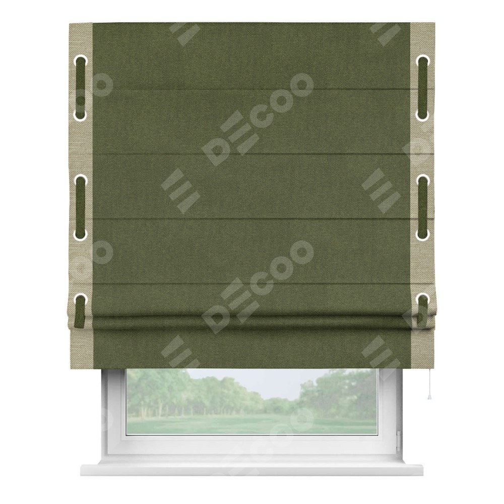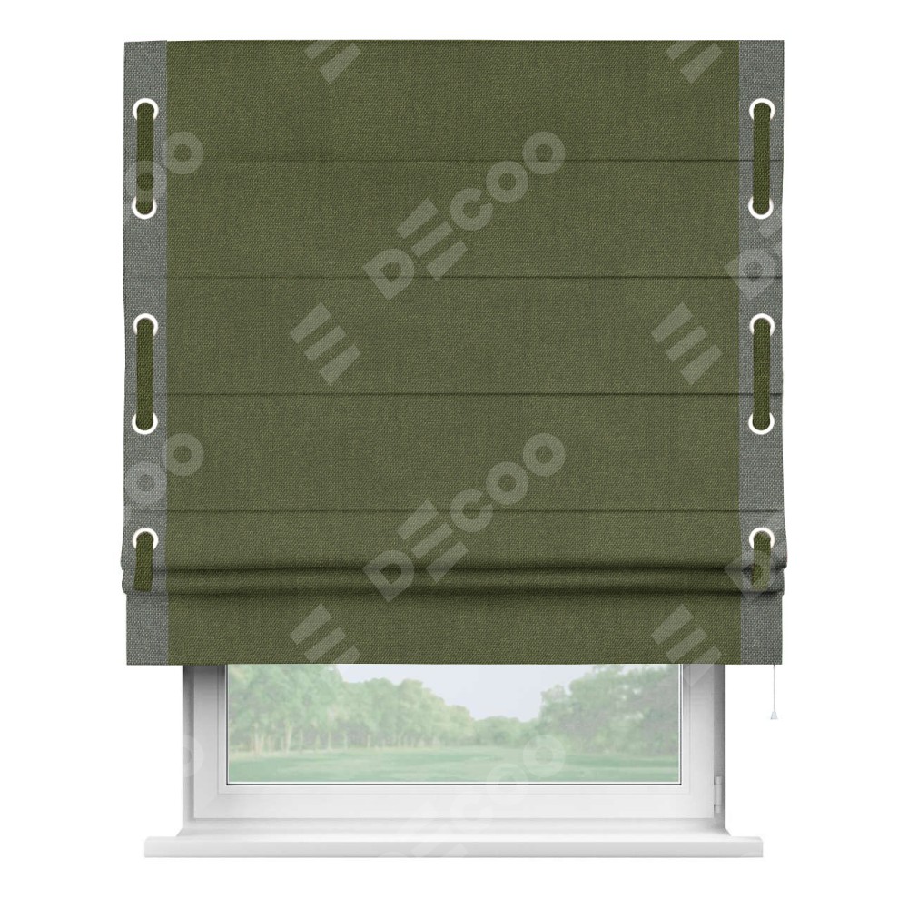 Римская штора «Кортин» для проема, лён димаут салатовый с кантом Стрим Дуо (люверсы с пояском)