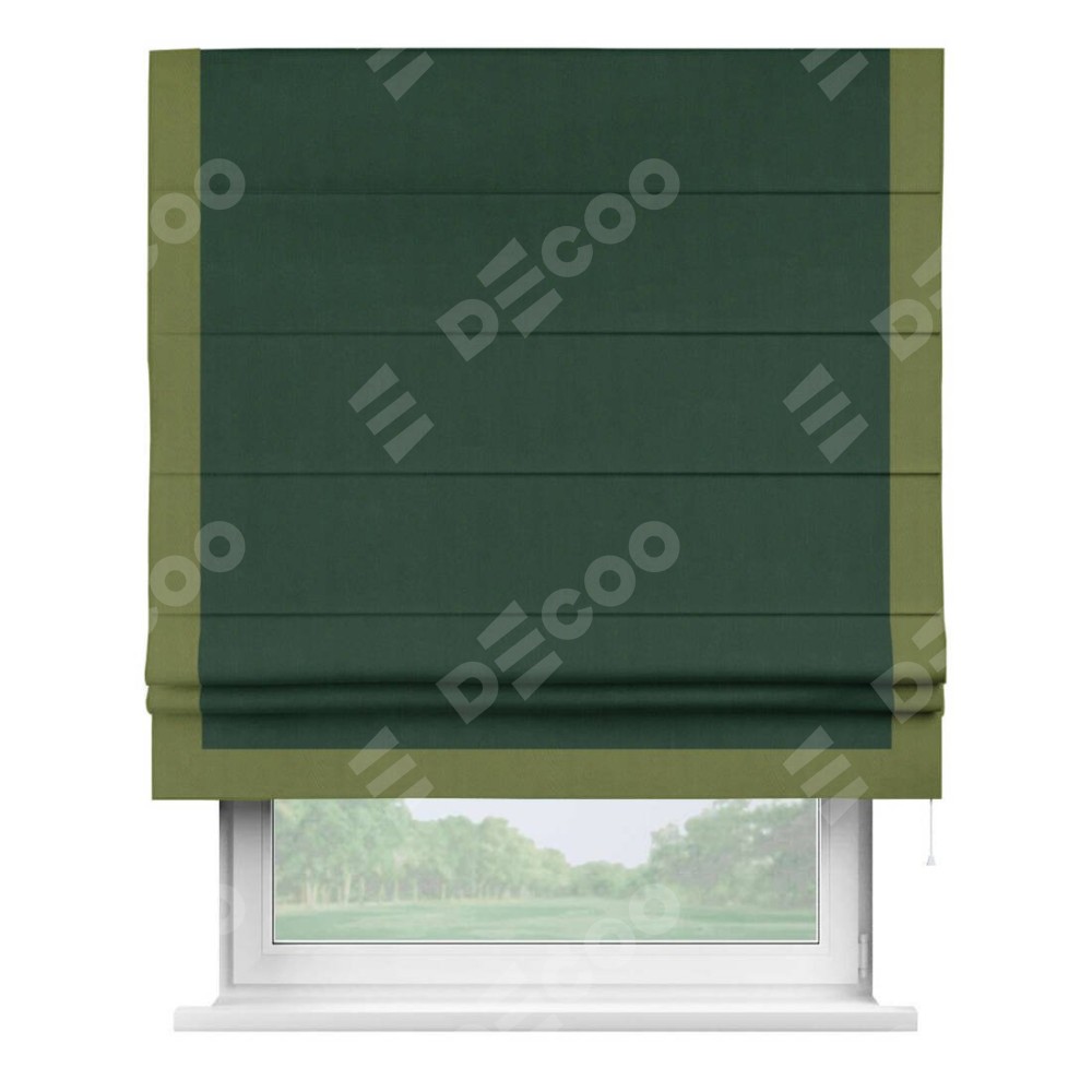 Римская штора производителя «Cortin», используется для проёма, пошита из ткани блэкаут однотонный зелёный, артикул ткани 91572−2. Отделка шторы кантом «Виктория», ткань для канта используется из блэкаута однотонного разной расцветки на выбор. Имеет универсальный механизм и подходит для монтажа: на потолок, на стену и в нишу.
