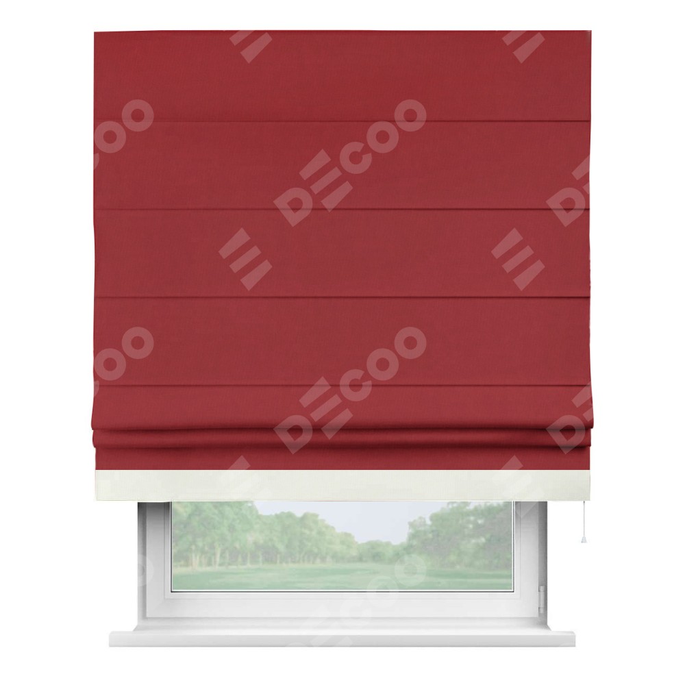 Римская штора производителя «Cortin», используется для проёма, пошита из ткани канвас красный, артикул ткани v-113. Отделка шторы кантом «Джестер» (молочный v-93), ткань для канта используется из канваса разной расцветки на выбор. Имеет универсальный механизм и подходит для монтажа: на потолок, на стену и в нишу.