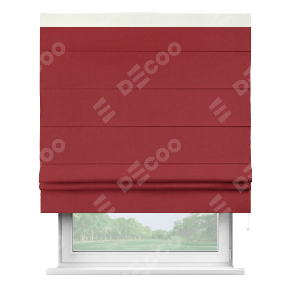 Римская штора производителя «Cortin», используется для проёма, пошита из ткани канвас красный, артикул ткани v-113. Отделка шторы кантом «Кинг» (молочный v-93), ткань для канта используется из канваса разной расцветки на выбор. Имеет универсальный механизм и подходит для монтажа: на потолок, на стену и в нишу.