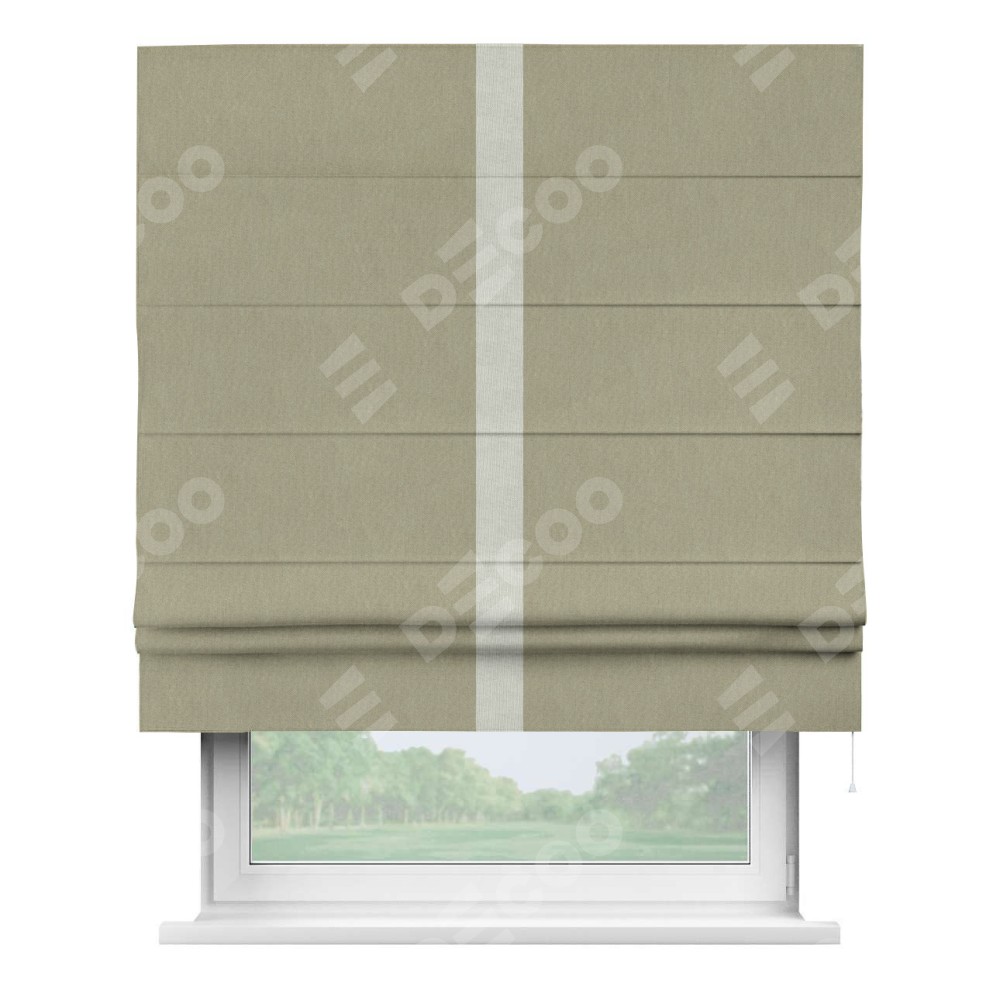 Римская штора производителя «Cortin», используется для проёма, пошита из ткани канвас латте, артикул ткани v-12490. Отделка шторы кантом «Хайвей» (светло-серый v-371), ткань для канта используется из канваса разной расцветки на выбор. Имеет универсальный механизм и подходит для монтажа: на потолок, на стену и в нишу.