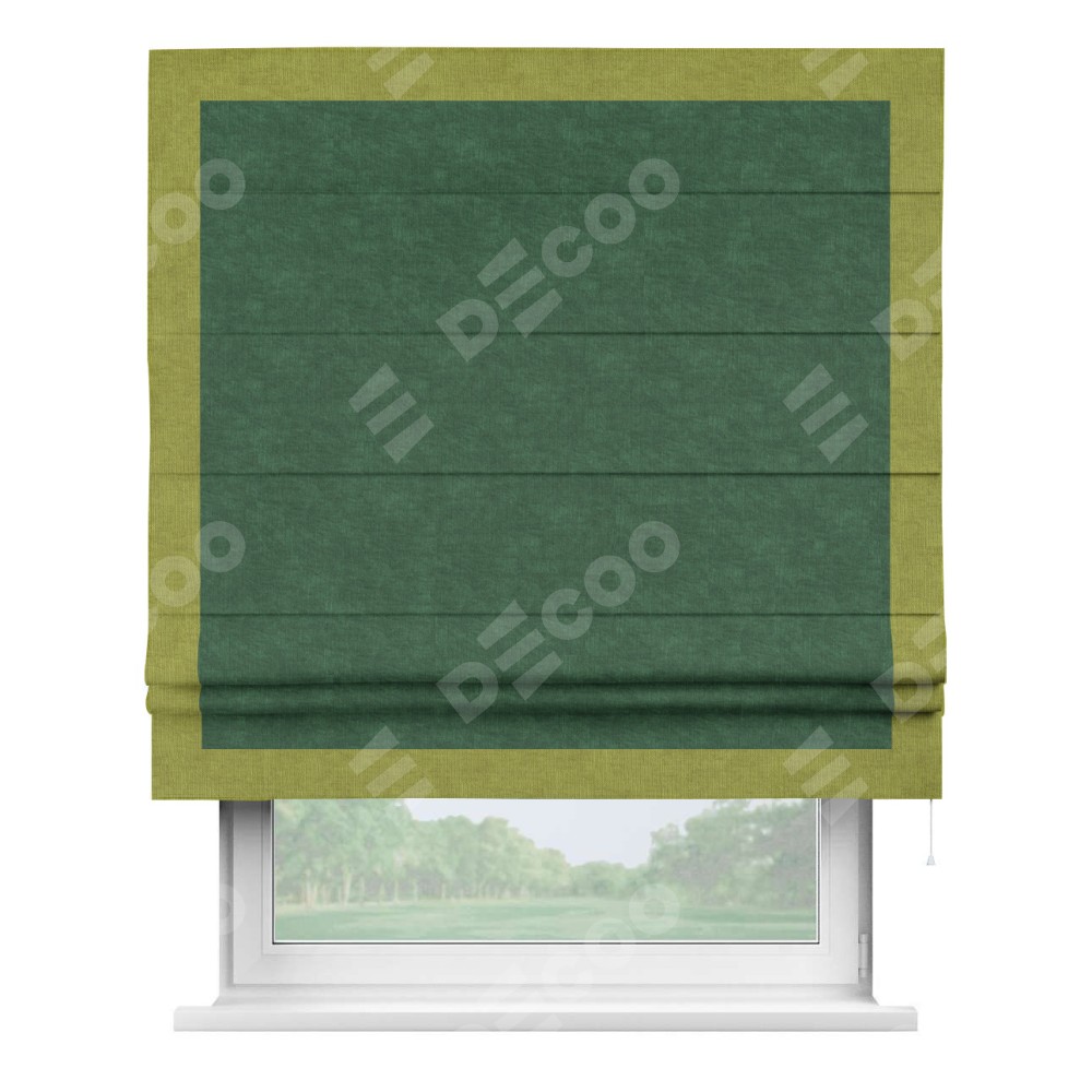 Римская штора производителя «Cortin», используется для проёма, пошита из ткани канвас тёмно-зелёный, артикул ткани v-469. Отделка шторы кантом «Чесс» (зелёное яблоко v-370), ткань для канта используется из канваса разной расцветки на выбор. Имеет универсальный механизм и подходит для монтажа: на потолок, на стену и в нишу.