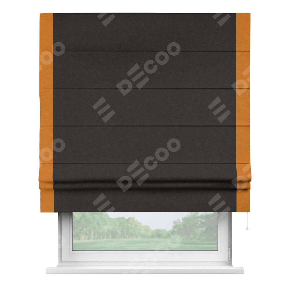 Римская штора производителя «Cortin», используется для проёма, пошита из ткани канвас тёмно-коричневый, артикул ткани v-13. Отделка шторы кантом «Стрим Дуо» (оранжевый v-106), ткань для канта используется из канваса разной расцветки на выбор. Имеет универсальный механизм и подходит для монтажа: на потолок, на стену и в нишу.