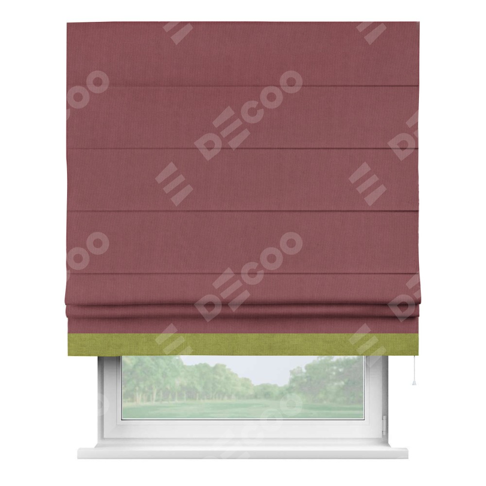 Римская штора производителя «Cortin», используется для проёма, пошита из ткани канвас ягодный, артикул ткани v-28. Отделка шторы кантом «Джестер» (зелёное яблоко v-370), ткань для канта используется из канваса разной расцветки на выбор. Имеет универсальный механизм и подходит для монтажа: на потолок, на стену и в нишу.