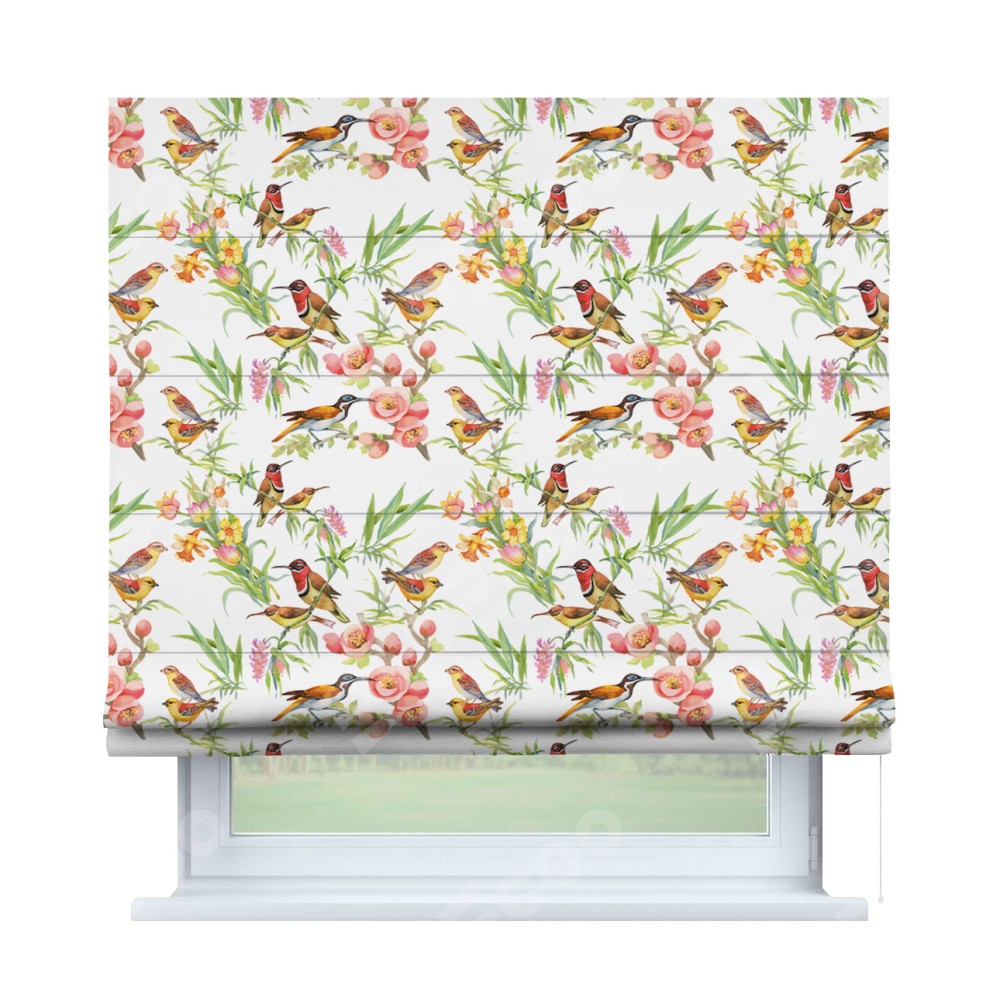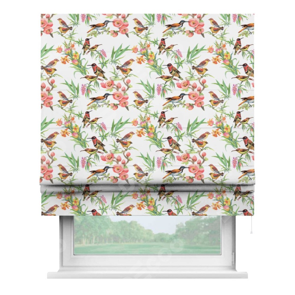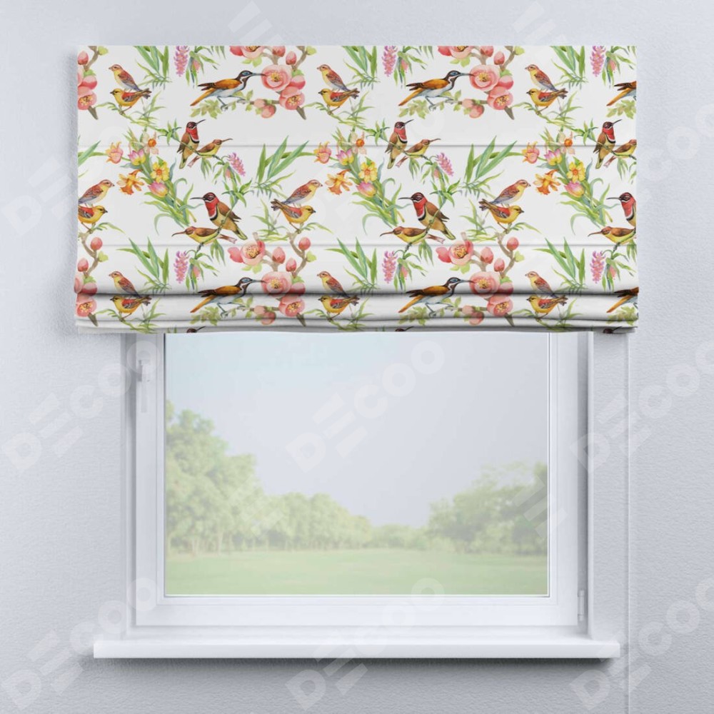 Классическая римская штора производителя «Cortin», пошита из ткани блэкаут с нанесением сублимационной печати «Певчие птички». Имеет универсальный механизм и подходит для монтажа: на потолок, на стену и в нишу.
