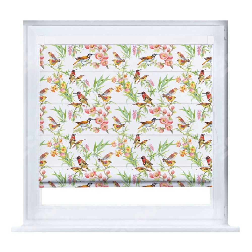 Римская штора производителя «Cortin», устанавливается на створку окна, пошита из ткани блэкаут с нанесением сублимационной печати «Певчие птички». Штора шьётся по индивидуальным размерам, для данного типа римской шторы возможная ширина от 35 до 150 см., высота до 250 см.