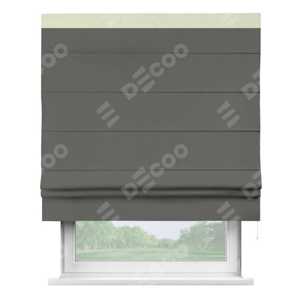 Римская штора производителя «Cortin», используется для проёма, пошита из ткани блэкаут однотонный тёмно-серый, артикул ткани 91570. Отделка шторы кантом «Кинг», ткань для канта используется из блэкаута однотонного разной расцветки на выбор. Имеет универсальный механизм и подходит для монтажа: на потолок, на стену и в нишу.