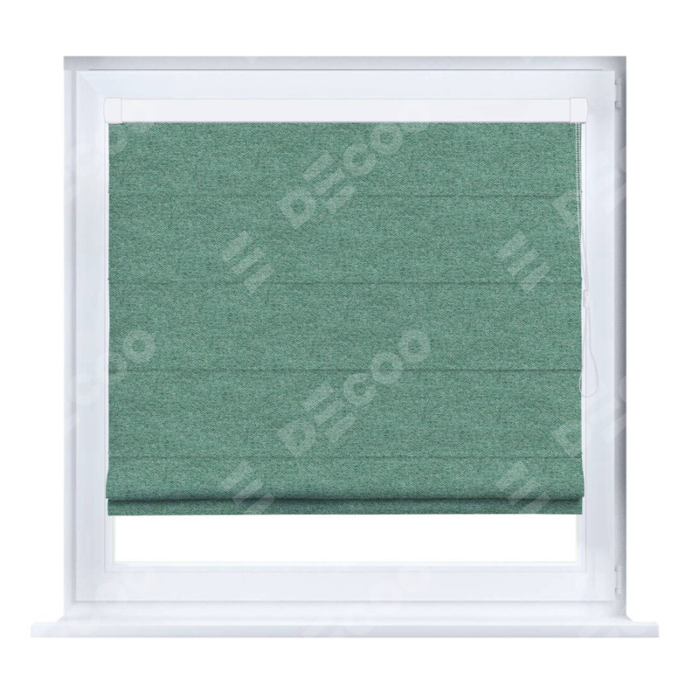 Римская штора производителя «Cortin», устанавливается на створку окна, пошита из ткани твид блэкаут бирюзовый, артикул 90934. Штора шьётся по индивидуальным размерам, для данного типа римской шторы возможная ширина от 35 до 150 см., высота до 250 см.