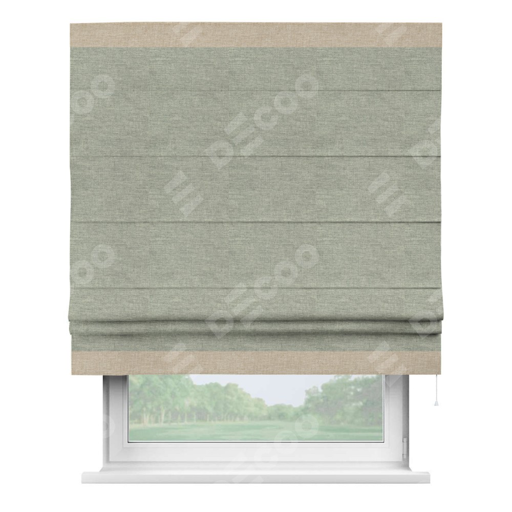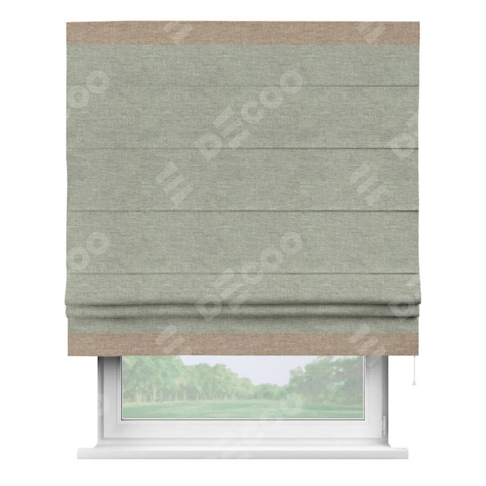 Римская штора производителя «Cortin», используется для проёма, пошита из ткани лён кашемир серый new, артикул 21618. Отделка шторы кантом «Горизонт», ткань для канта используется из льна разной расцветки на выбор. Имеет универсальный механизм и подходит для монтажа: на потолок, на стену и в нишу.