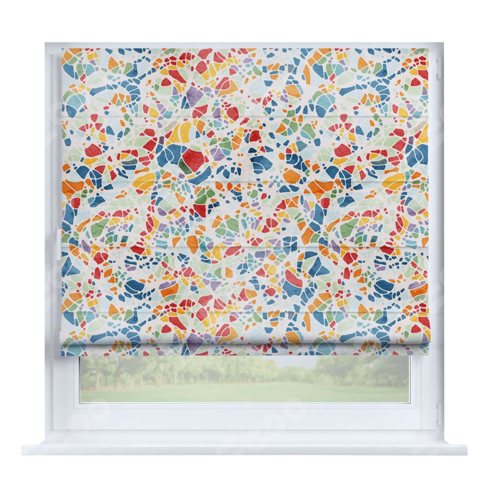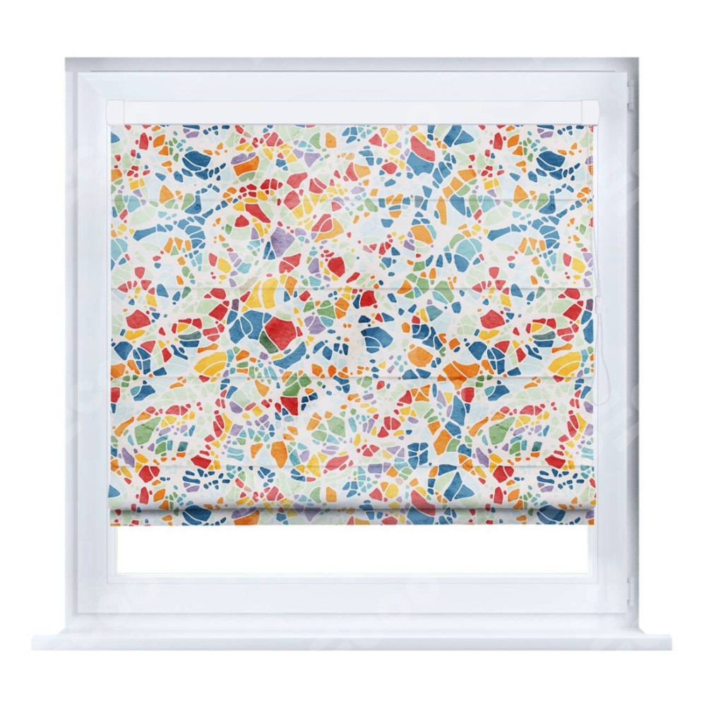 Римская штора производителя «Cortin», устанавливается на створку окна, пошита из ткани блэкаут с нанесением сублимационной печати «Калейдоскоп». Штора шьётся по индивидуальным размерам, для данного типа римской шторы возможная ширина от 35 до 150 см., высота до 250 см.