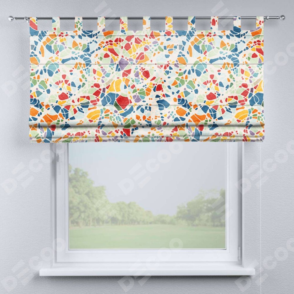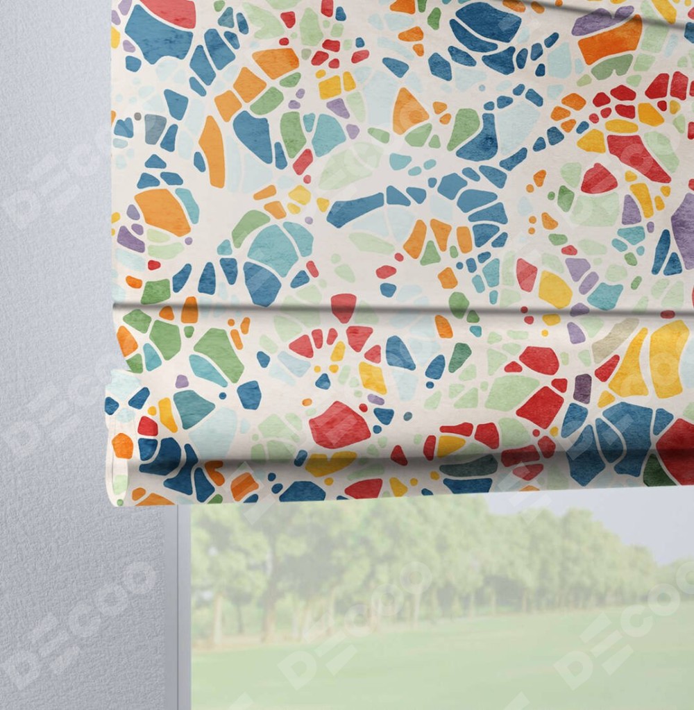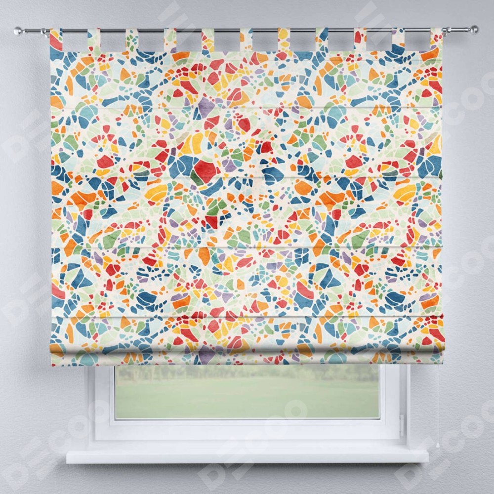 Римская штора производителя «Cortin», используется для проёма, пошита из ткани блэкаут с нанесением сублимационной печати «Калейдоскоп». Данная модель пошита на петлях, комплектуется на выбор круглым карнизом и подходит для монтажа на стену. Римская штора на петлях имеет простую систему регулировки высоты, отличительным преимуществом данной модели является простой способ монтажа. Достаточно повесить ее на трубу и штора готова!